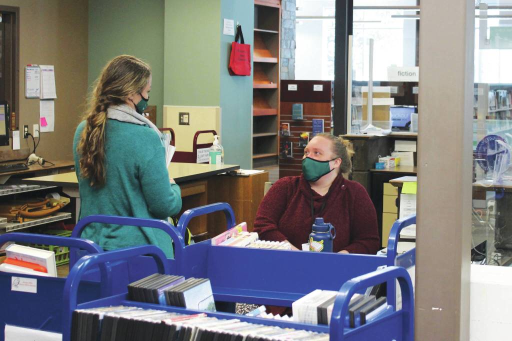 Ryanna Thurman (right) speaks to a library employee at the Soldotna Public Library on Thursday, March 25 in Soldotna, Alaska. (Ashlyn O’Hara/Peninsula Clarion)