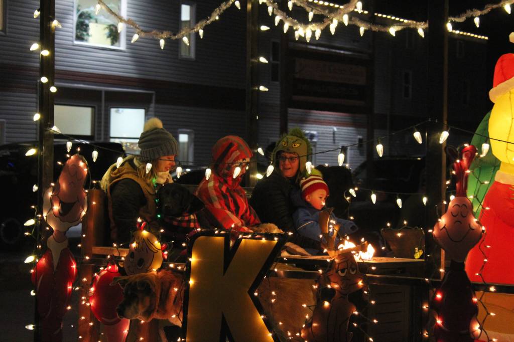 Well before the annual electric lights parade kicked off at 6 p.m., cars lined up and bundled spectators huddled on the sidewalk. The caravan headed down Frontage Road toward the visitor center, where a bonfire warmed a crowd, and featured inflatable Christmas characters, vehicles wrapped in lights and Santa Claus aboard a Kenai Fire Department fire engine.