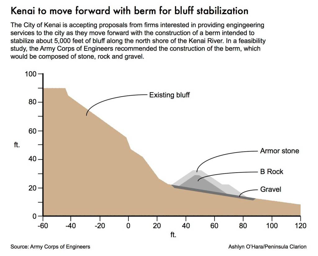 The bluff is currently receding at a rate of about 3 feet per year, with the tentative stabilization plan to construct a berm at the toe of the bluff, per a recommendation from the Army Corps of Engineers. The total project cost will be split between the federal government, which will pay 65%, and the City of Kenai, which will pay 35%.