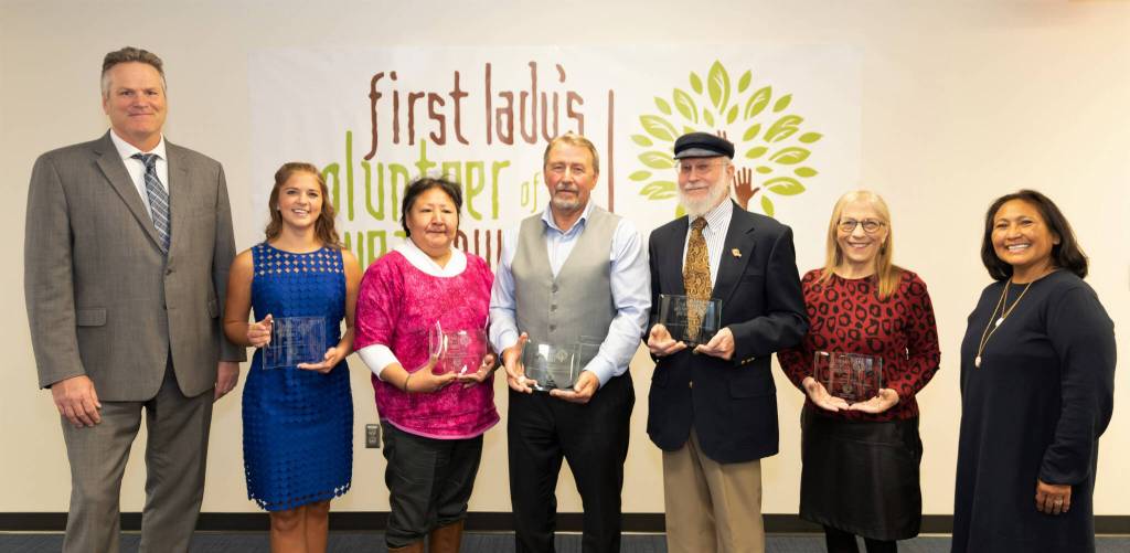 First Lady Rose Dunleavy, far right, and Gov. Mike Dunleavy, far right, pose with the 2021 Volunteer of the Year honorees. From left to right are Gov. Dunleavy, Anna DeVolld, Rachel Sallaffie, John Green, Carl Schrader, Nona Safra, and First Lady Dunleavy. (Photo by Stanley Wright)