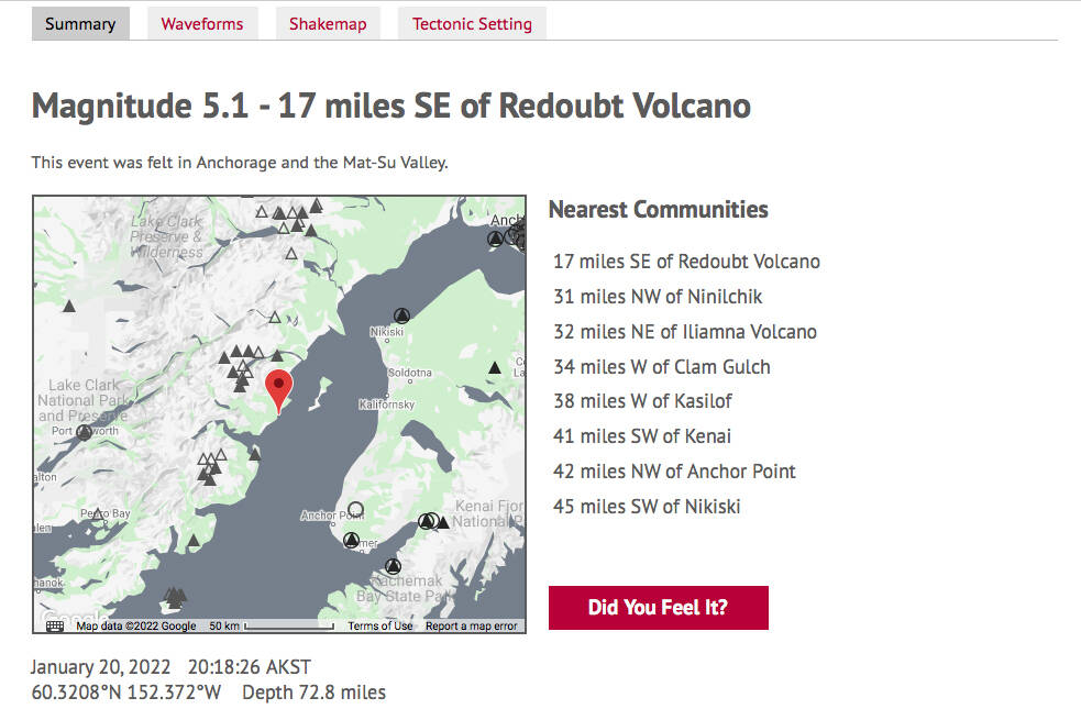 The central Kenai Peninsula felt a jolt Thursday night when a 5.1 magnitude earthquake struck the western side of Cook Inlet.