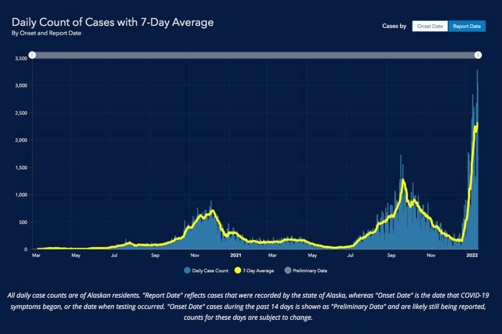 Data from the state of Alaska show a steep increase in COVID-19 cases in January 2022. (Department of Health and Social Services)