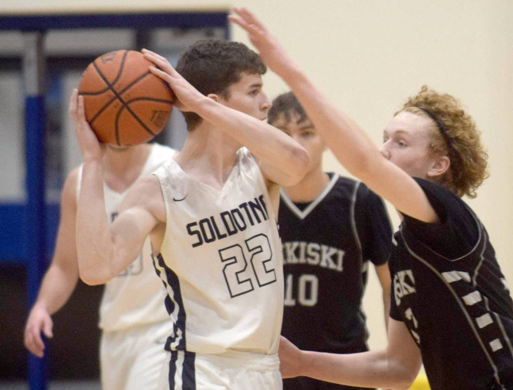 Soldotna’s Ethan Sewell handles pressure from Nikiski’s Brady Bostic on Tuesday, Feb. 8, 2022, at Soldotna High School in Soldotna, Alaska. (Photo by Camille Botello/Peninsula Clarion)