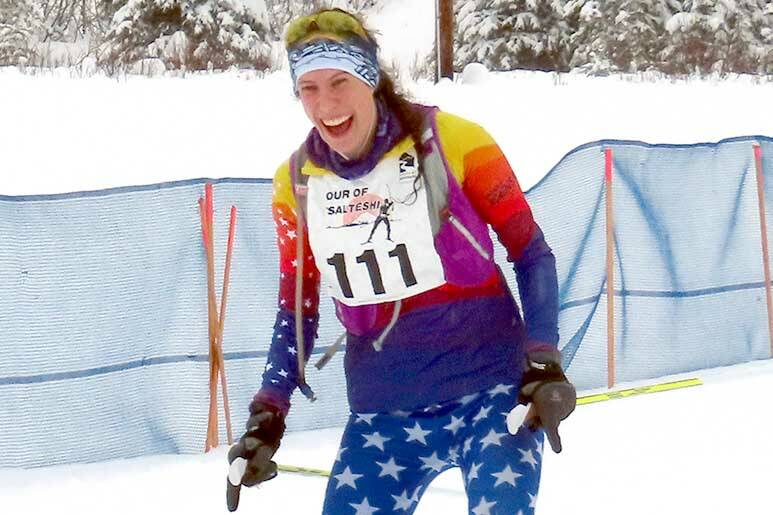 Homer’s Tara Schmidt is all smiles after finishing the 40-kilometer freestyle race despite breaking a ski early in the race Sunday in the Tour of Tsalteshi. (Photo courtesy of Jenny Neyman/Tsalteshi Trails)