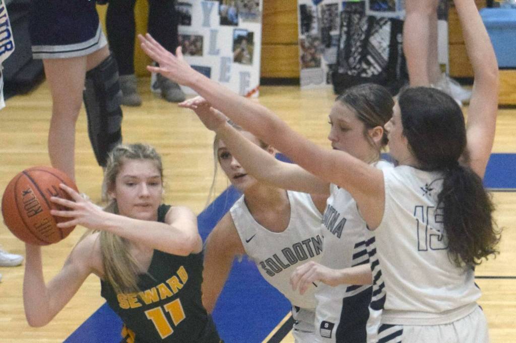 Seward's Lena Jagielski passes under pressure from Jolie Widaman, Katelyn Morrison and Adarra Hagelund on Thursday, March 3, 2022, at Soldotna High School in Soldotna, Alaska. (Photo by Jeff Helminiak/Peninsula Clarion)
