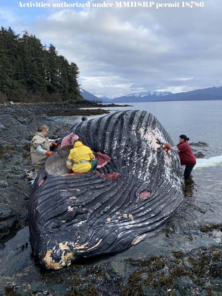 The humpback whale was first reported dead or stranded on Killisnoo Island on Feb. 10 by Alaska Marine Highway System personnel, said Sadie Wright, a large whale entanglement response coordinator with National Oceanic and Atmospheric Administration’s fisheries division.