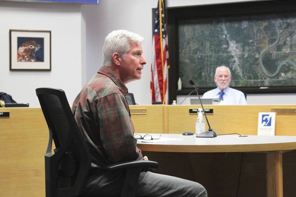 Soldotna Director of Economic Development and Planning John Czarnezki describes a plan for more parking in downtown Soldotna during a meeting of the Soldotna City Council on Wednesday, March 9, 2022, in Soldotna, Alaska. (Ashlyn O’Hara/Peninsula Clarion)