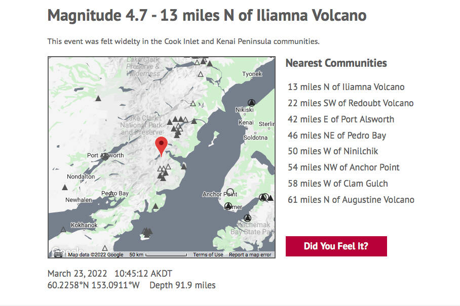 Wednesday’s tremor near Iliamna hit at a depth of 92 miles.
