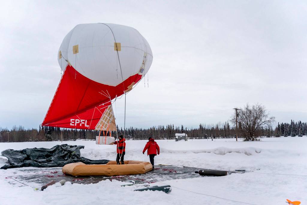 This Feb. 21, 2022, photo provided by the University of Alaska Fairbanks Geophysical Institute shows Swiss team members working with a tethered balloon and payload used to measure different characteristics of aerosols and trace gases in the atmosphere over Fairbanks, Alaska. Over seven weeks this winter, nearly 50 scientists from the continental U.S. and Europe descended on Fairbanks to study the sources of air pollution. (Daniel Walker/University of Alaska Fairbanks Geophysical Institute via AP)