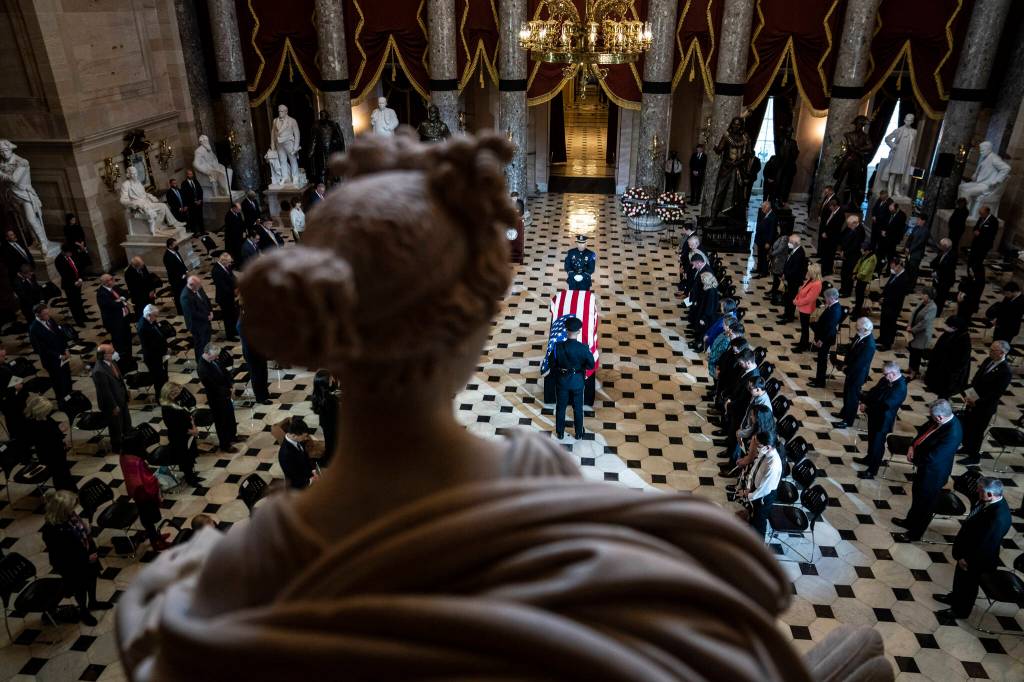 Attendance to the ceremony was limited to provide for social distancing. But colleagues and congressional aides lined up in the hours afterward to pay their respects one-by-one, pausing briefly to face the flag-draped coffin and reflect. President Joe Biden did so as well in the early afternoon. He gently placed his hands on the casket for a moment before providing a crisp salute.