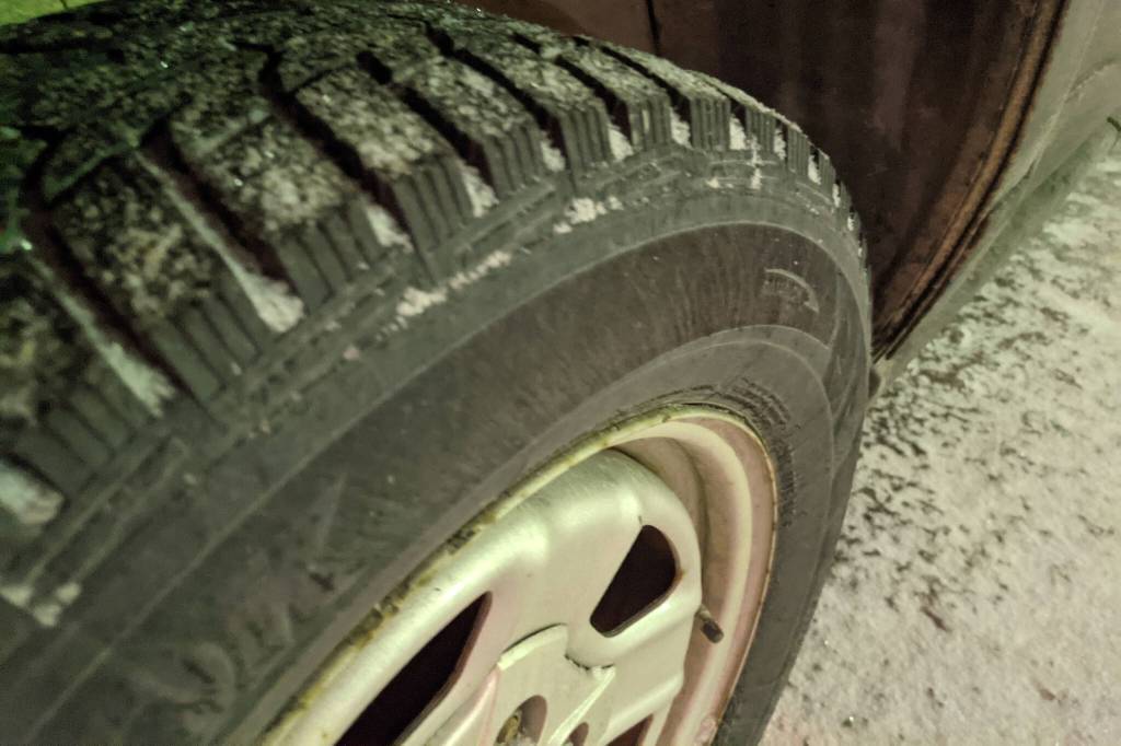 Snow falls on studded tires on Wednesday, April 7, 2021, in Kenai, Alaska. For Alaskans living above the 60 North Latitude line, which includes all portions of the Sterling Highway, studded tires must be removed by May 1, 2022. (Peninsula Clarion file)