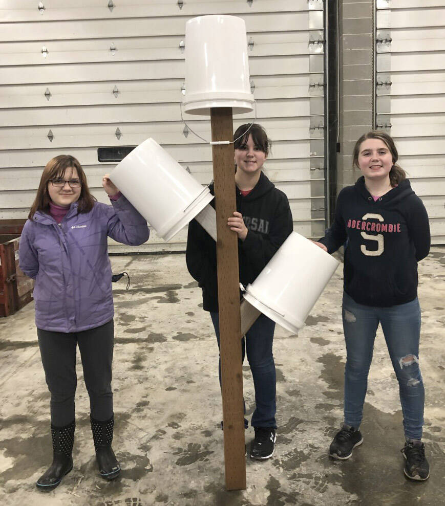 Girl Scouts Caitlyn, Kadie, Emma, and Lyberty work to bolt on the arm of the wooden structure they call a bucket tree. (Photo by Leah Eskelin)