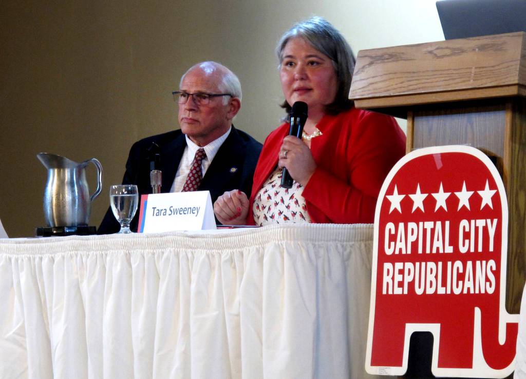 Republican Tara Sweeney, right, speaks Monday, May 16, 2022, at a forum in Juneau, Alaska, that was also attended by three other Republican candidates for Alaska’s U.S. House seat, including John Coghill, left. Sweeney and Coghill are among 48 candidates in a June 11 special primary for the House seat left vacant by the death earlier this year of Republican Rep. Don Young. (AP Photo/Becky Bohrer)