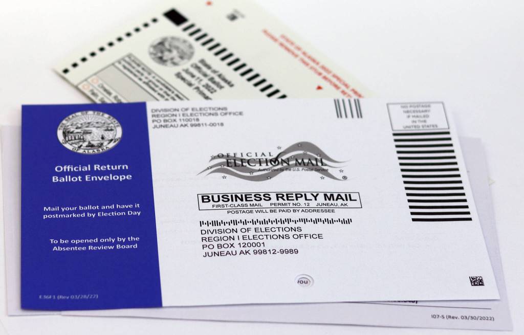 This photo shows a ballot and return envelope for the special primary election for Alaska’s lone seat in the U.S. House of Representatives. Ballots must be postmarked by June 11. (Ben Hohenstatt / Juneau Empire File)