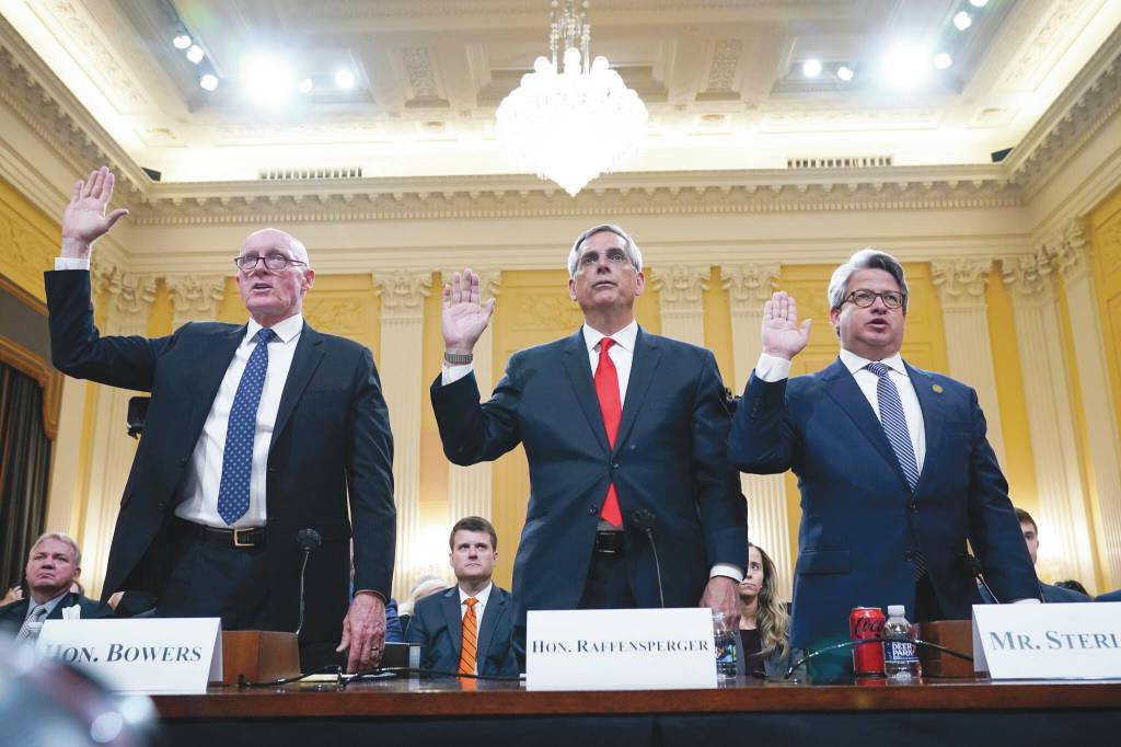 Rusty Bowers, Arizona state House Speaker, from left, Brad Raffensperger, Georgia Secretary of State, and Gabe Sterling, Georgia Deputy Secretary of State, are sworn in to testify as the House select committee investigating the Jan. 6 attack on the U.S. Capitol continues to reveal its findings of a yearlong investigation, at the Capitol in Washington, Tuesday.