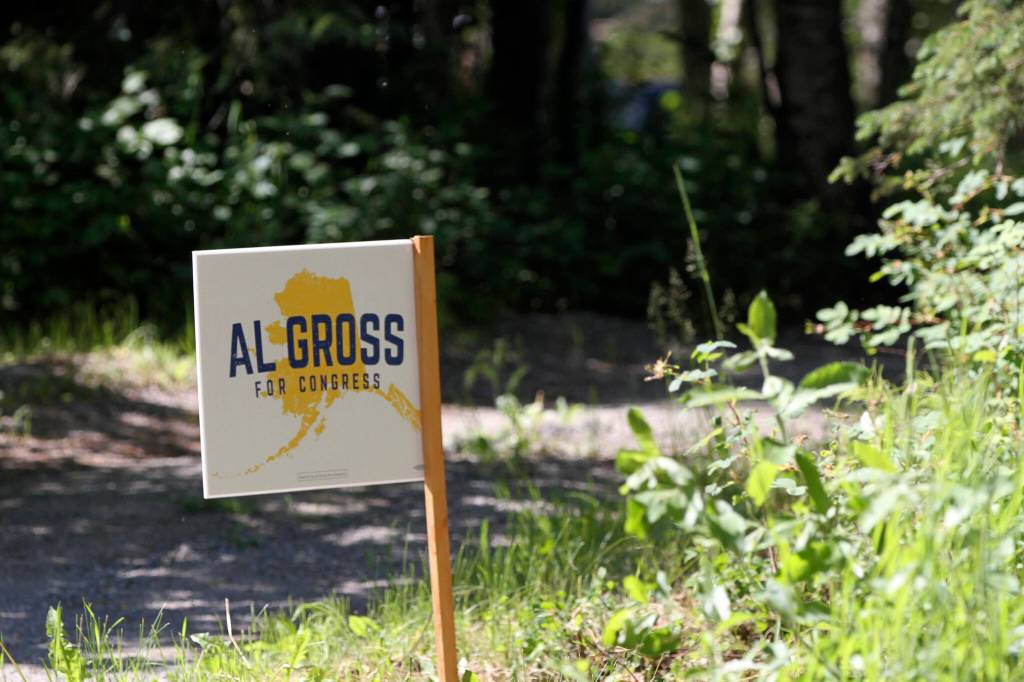 An "Al Gross for Congress" sign sits near the driveway to Gross’ home in Anchorage, Alaska, on Tuesday, June 21, 2022, after he announced plans to withdraw from the U.S. House race. Gross has given little explanation in two statements for why he is ending his campaign, and a woman who answered the door at the Gross home asked a reporter to leave the property. (AP Photo/Mark Thiessen)