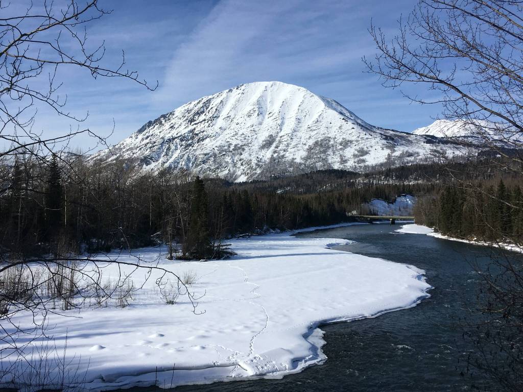 The Sterling Highway crosses the Kenai River near the Russian River Campground on March 15, 2020, near Cooper Landing, Alaska. (Jeff Helminiak/Peninsula Clarion)