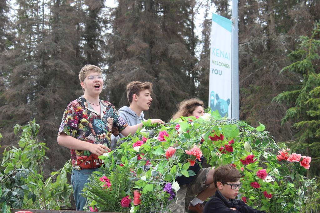 The cast of the Disney musical “Tarzan,” which is being performed at Soldotna Creek Park beginning Saturday, rides the Triumvirate Theatre float during the Kenai 4th of July Parade on Monday, July 4, 2022, in Kenai, Alaska. (Camille Botello/Peninsula Clarion)