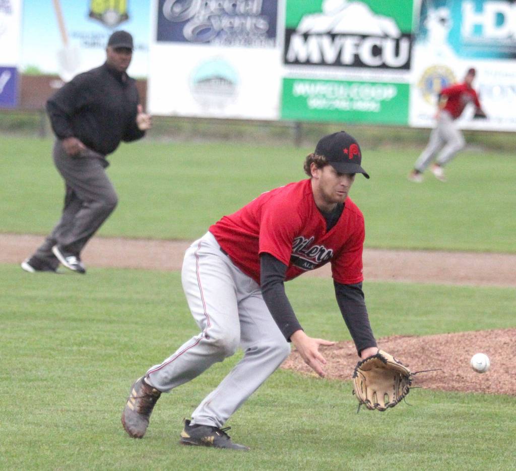 Peninsula Oilers pitcher Conner Kershaw fields a short ground ball against the Mat-Su Miners on Friday, July 15, 2022, at Hermon Brothers Field in Palmer, Alaska. (Photo by Jeremiah Bartz/Frontiersman)