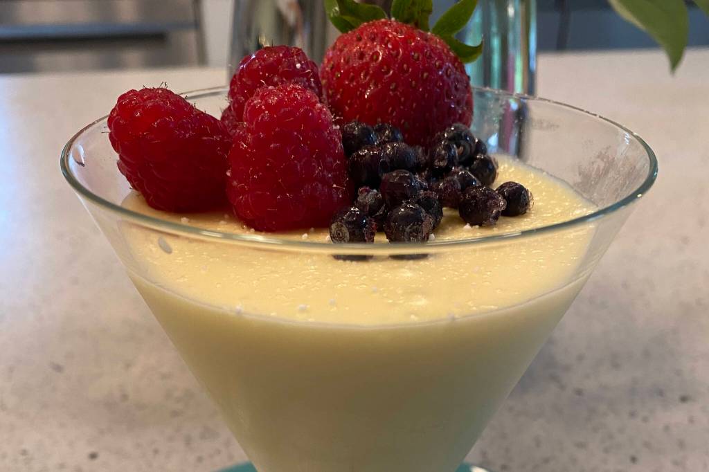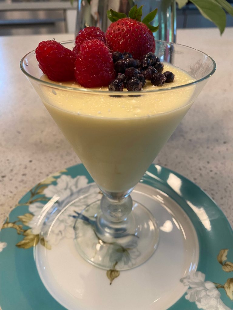 We had my in-laws over for dinner and pinochle this past weekend and, since it was our first time hosting game night in our new house, I wanted to make it a little special with a dessert I knew they would enjoy: Bavarian cream and berries.