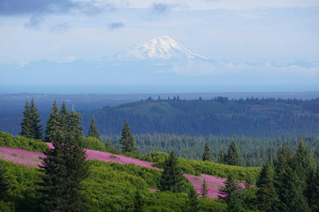Mt. Redoubt rises above Cook Inlet and the Anchor River drainage as fireweed is in bloom, as seen from Diamond Ridge Road on Friday, July 22, 2022, near Homer, Alaska. (Photo by Michael Armstrong/Homer News)