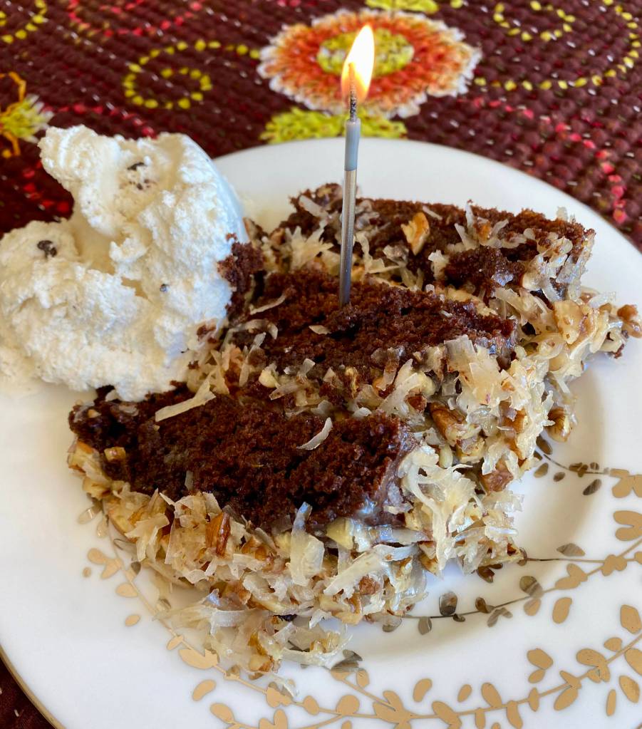 This German chocolate cake is rich and decadent and looks beautiful with a sparkling candle on top.