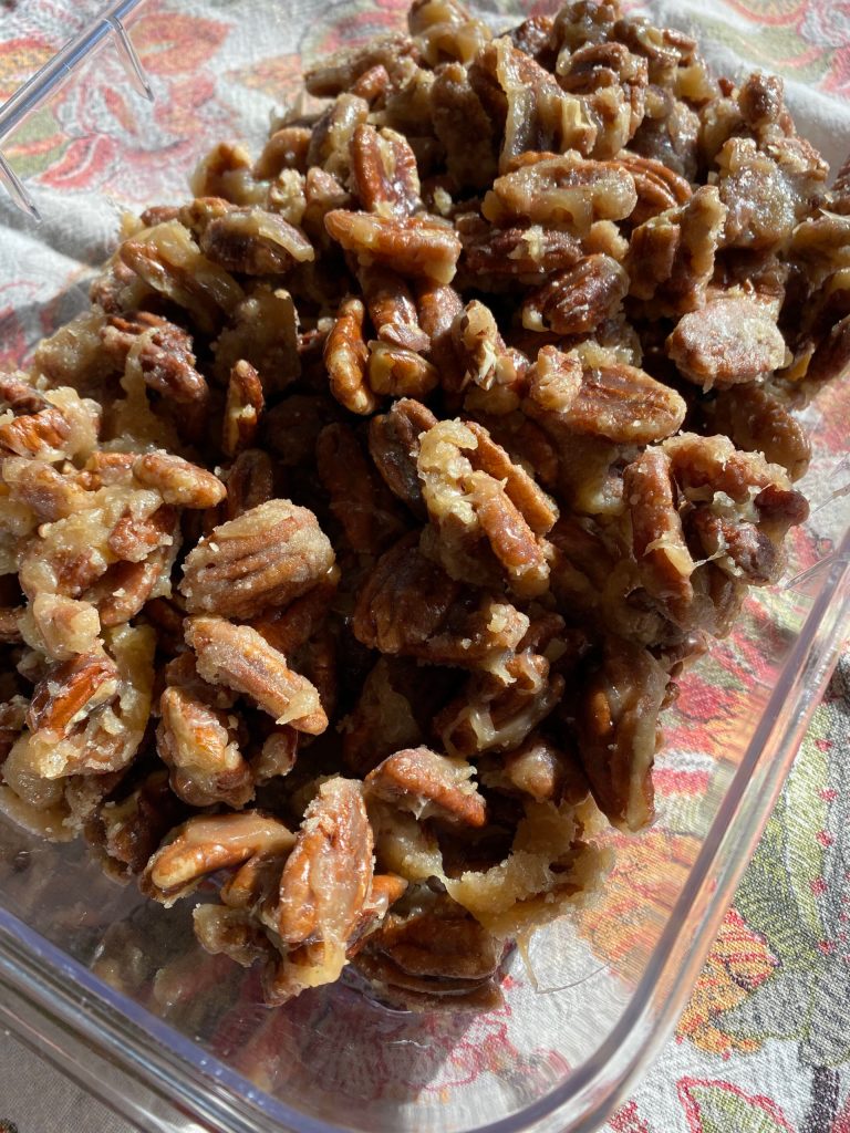 Turn off the heat, stir in the vanilla, then add the pecans and toss until the nuts are evenly coated and shiny.