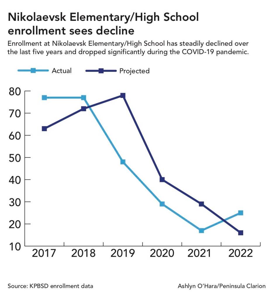 School enrollment data show that Nikolaevsk’s total enrollment has gone down since 2017, from a total enrollment of 62 students in March of 2017, to a total enrollment of 10 in March of 2022. Most recent school data show that there were 25 students enrolled as of last month.