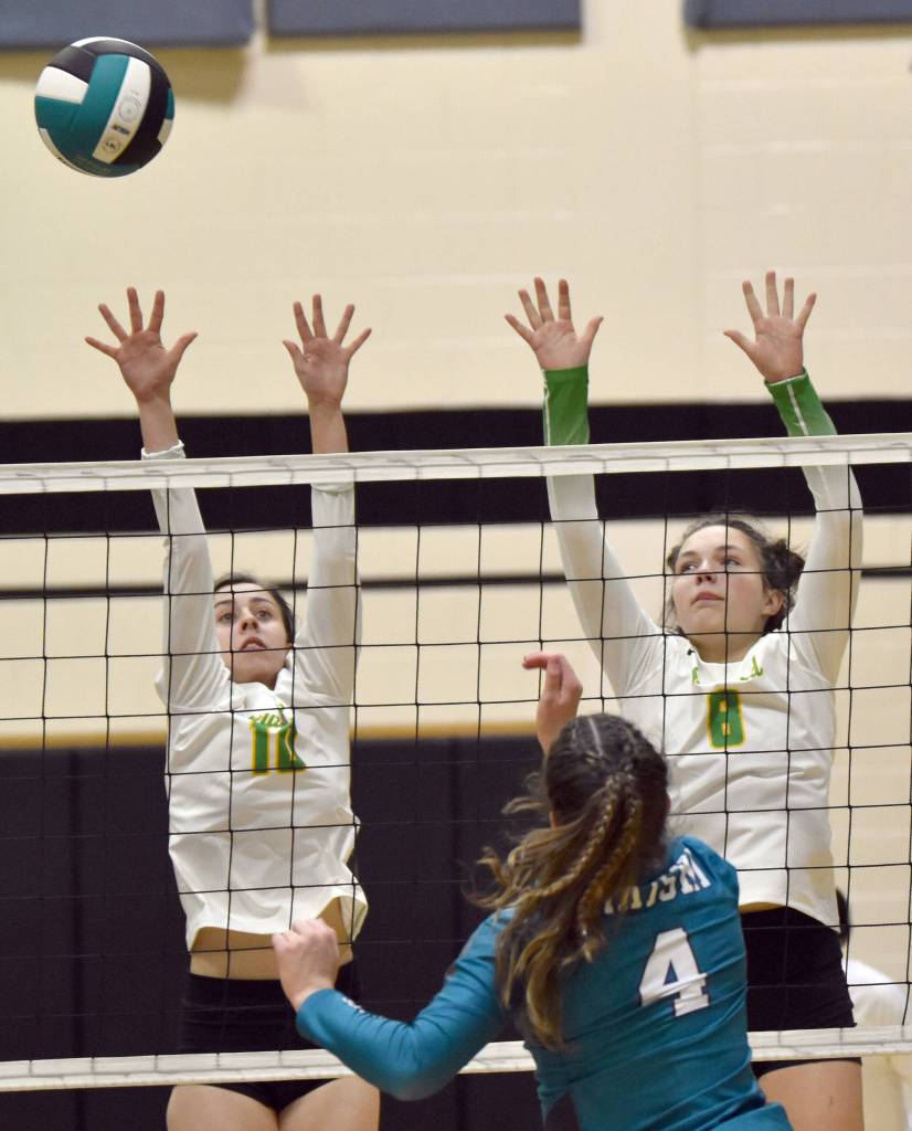 Seward’s Teyla Ramsey and Mikinley Williams try to block Nikiski’s Savanna Stock on Thursday, Oct. 13, 2022, at Nikiski High School in Nikiski, Alaska. (Photo by Jeff Helminiak/Peninsula Clarion)
