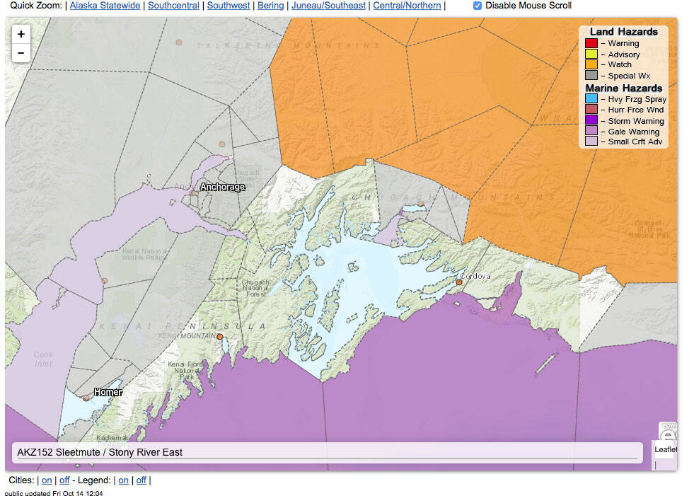 A special weather statement for the western Kenai Peninsula has been issued by the National Weather Service. (Screenshot weather.gov)