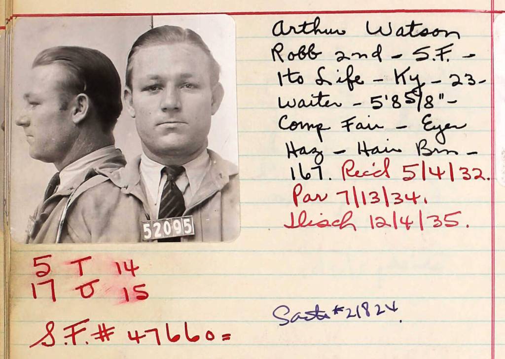 Watson was 21 years old when he was arrested for vagrancy in Los Angeles in March 1930 and spent four days in jail. In 1932 — after a second vagrancy charge in 1931 — he was arrested for robbery in San Francisco and was sentenced to San Quentin state prison. He was released on parole in July 1934.