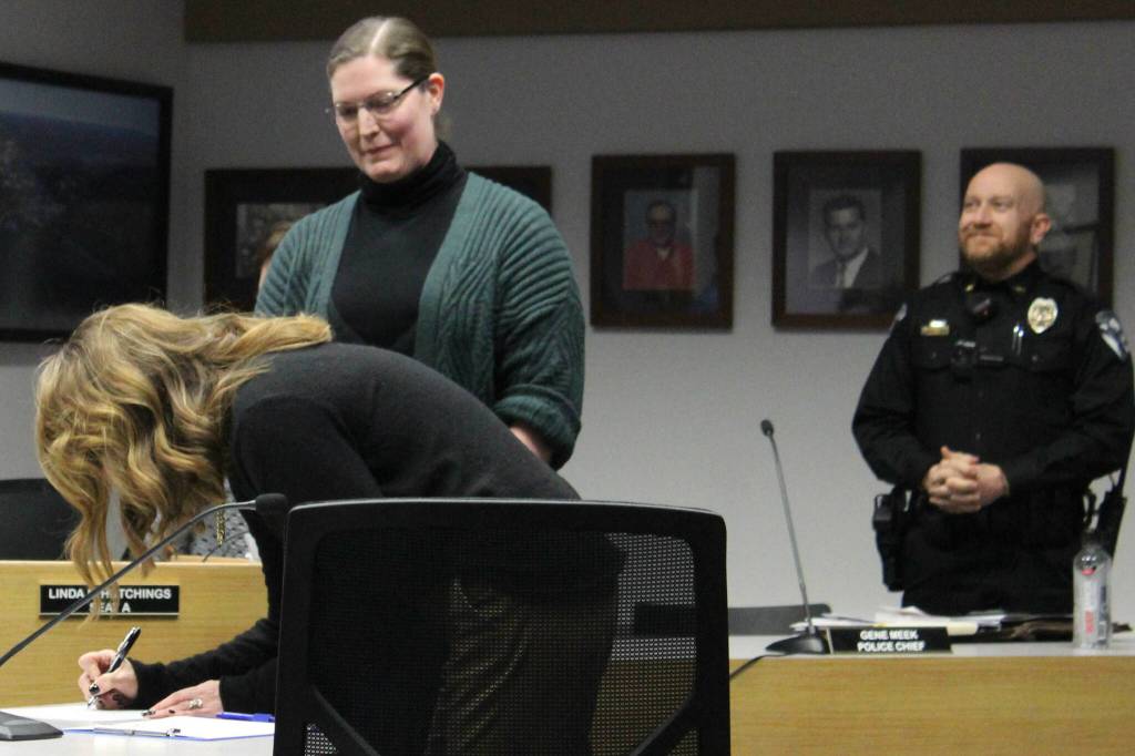 Johni Blankenship signs her name after being sworn in as Soldotna City Clerk at a city council meeting on Wednesday, Nov. 30, 2022, in Soldotna, Alaska. (Ashlyn O’Hara/Peninsula Clarion)