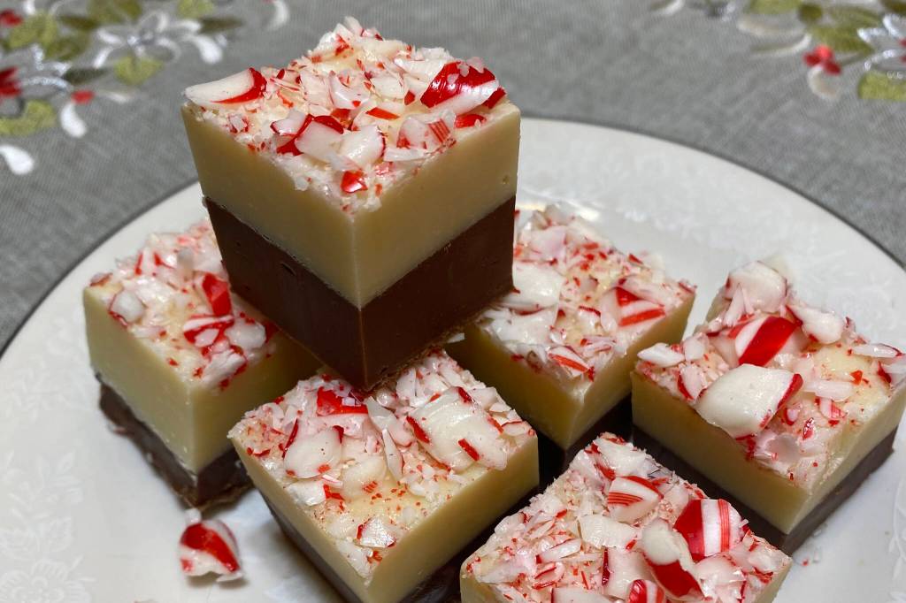Sprinkle on the crushed candy cane, pressing down to imbed some pieces in the fudge.