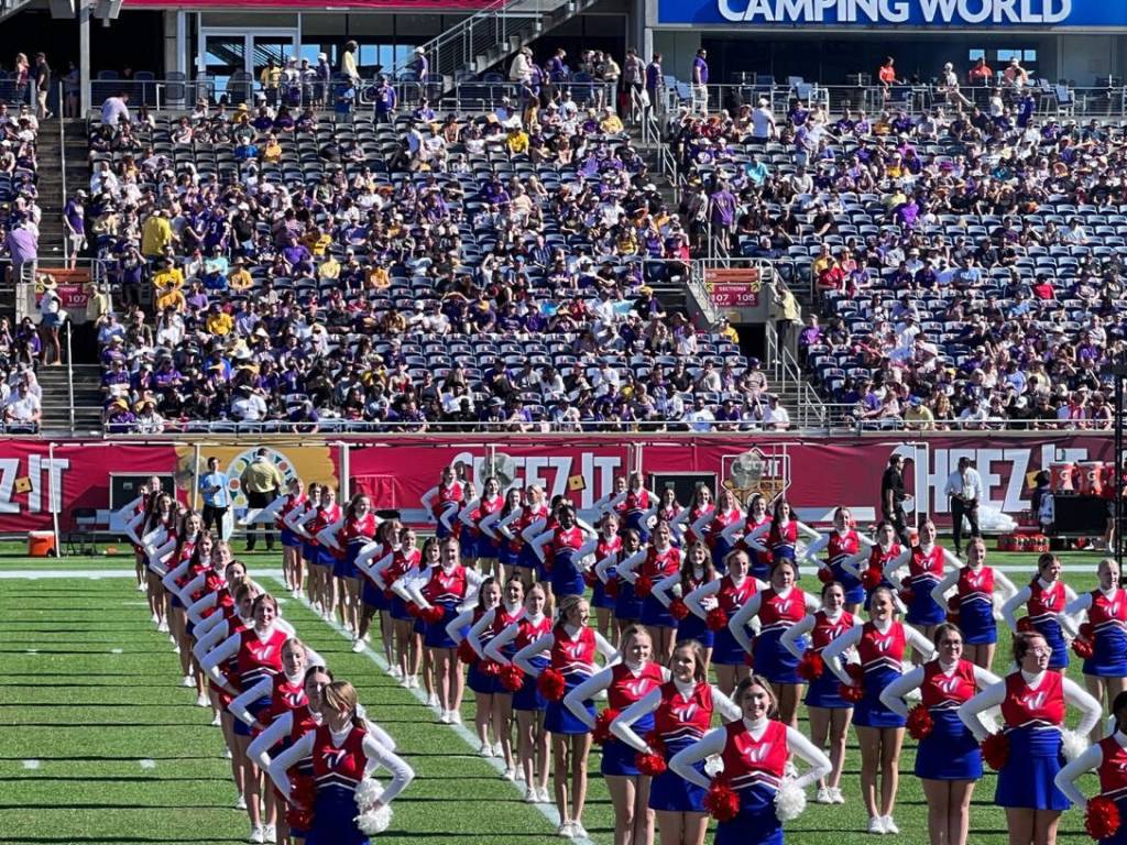 On Monday, nine Kenai Central High School cheerleaders joined hundreds of others from around the country in a pre-show performance ahead of the bout between Louisiana State University and Purdue University at the Citrus Bowl at Camping World Stadium in Orlando, Florida.
