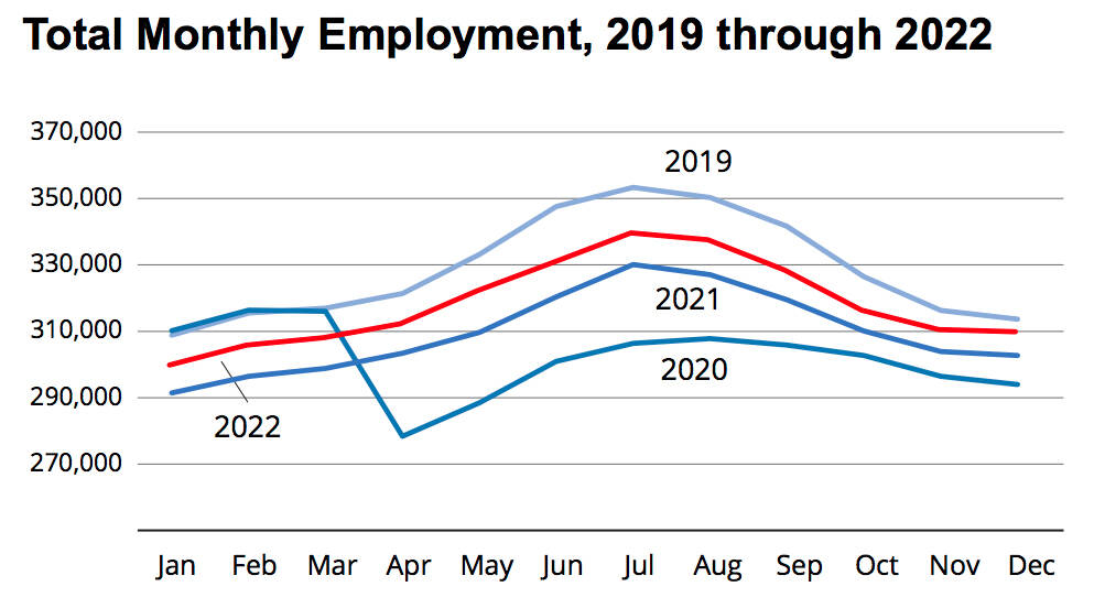 Graph showing monthly changes in employment from 2019 to 2022, by the Alaska Department of Labor and Workforce Development using data from their Research and Analysis Section. (Screenshot)