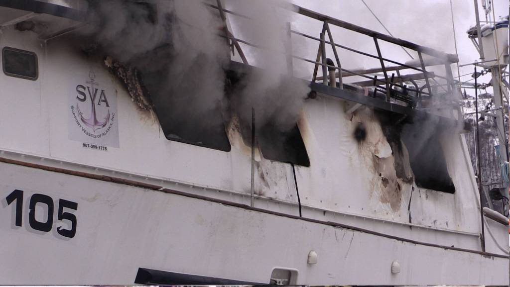 Smoke emerges from R/V Qualifier, which caught on fire in the Northern Enterprises Boatyard on Kachemak Drive, Jan. 19.