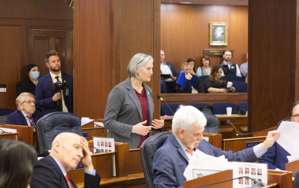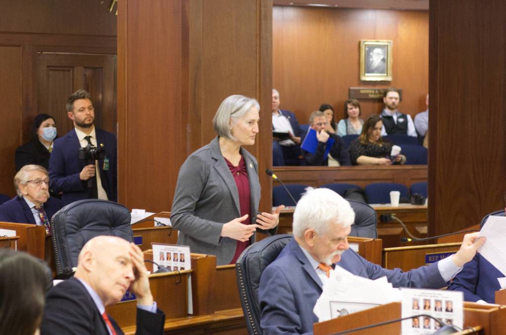 State Rep. Rebecca Himschoot, I-Sitka, offers an overview Wednesday of Southeast Alaska’s commercial troll fisheries while asking for support on a resolution opposing a lawsuit by a Washington-based group that would shut the fisheries down due to their alleged impacts on species in that state. The resolution passed by a 35-1 vote.