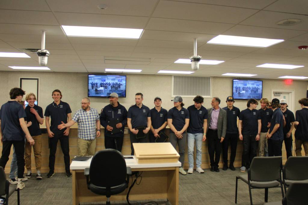 Soldotna High School’s hockey team was commended at Tuesday’s Kenai Peninsula Borough Assembly meeting for their triumph in February’s Division II state championship — the first such win in the program’s history.