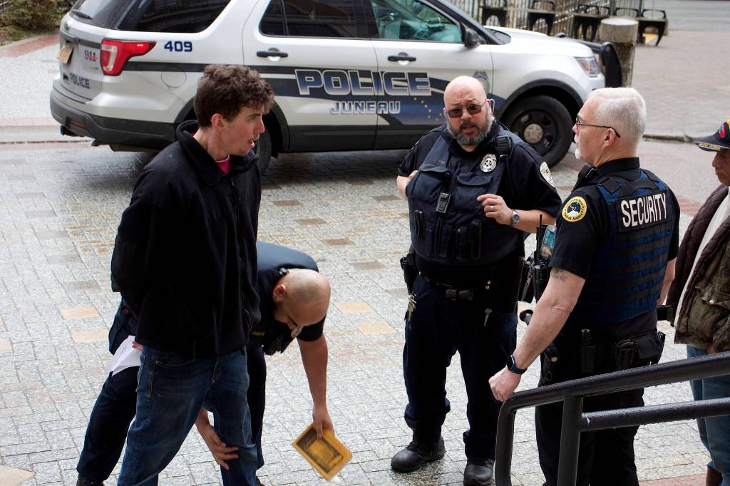 But he never got that chance, as about an hour later he was arrested on suspicion of criminal trespass after a “fight in the sky bridge of the State Office Building,” said Lt. Krag Campbell of the Juneau Police Department. The arrest occurred shortly after two officers saw him on the sidewalk in front of the Capitol.