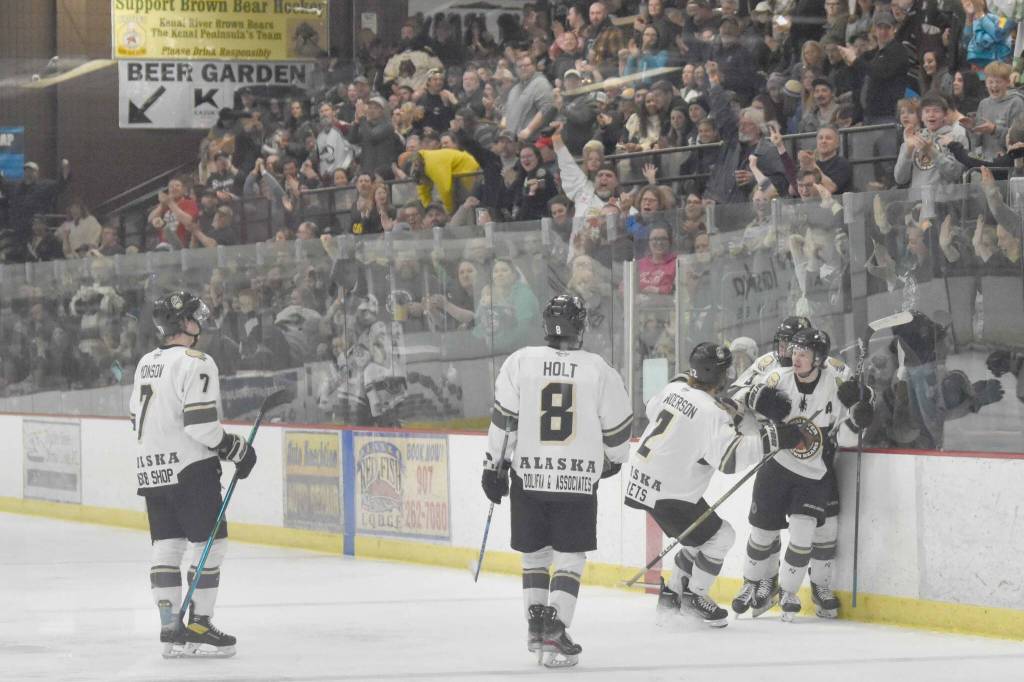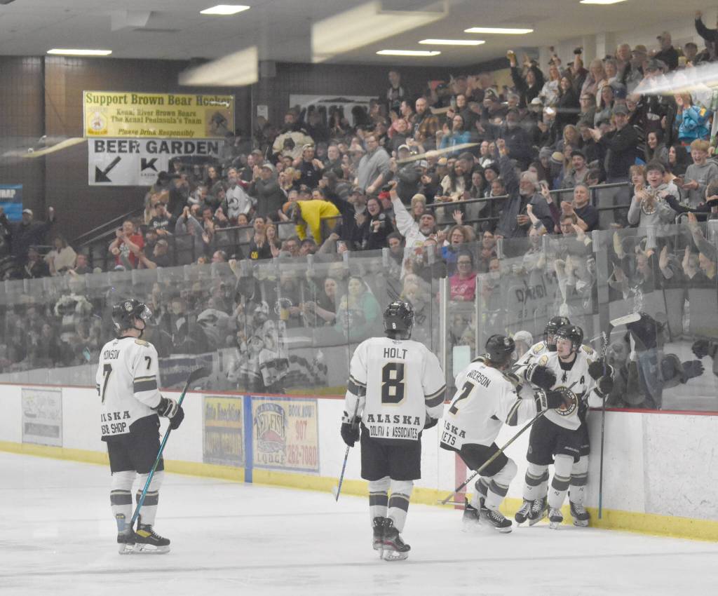The Kenai River Brown Bears celebrate a second-period goal by Nick Stevens on Friday, April 28, 2023, at the Soldotna Regional Sports Complex in Soldotna, Alaska. (Photo by Jeff Helminiak)