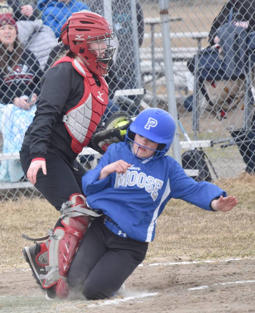 Kenai Central catcher Avery Ellis tags out Palmer’s Lizzy McQuillin at the plate Thursday, May 4, 2023, at Steve Shearer Memorial Ball Park in Kenai, Alaska. (Photo by Jeff Helminiak/Peninsula Clarion)