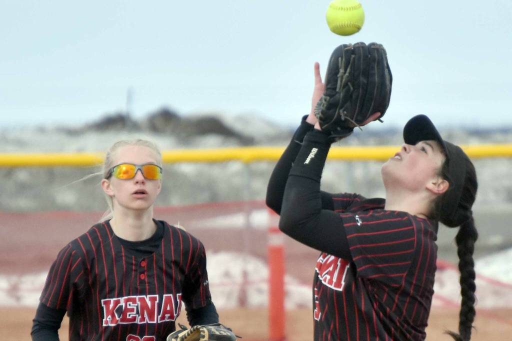 Kenai Central second baseman Kailey Stynsberg makes the catch in front of shortstop Zoey Riley on Thursday, May 4, 2023, at Steve Shearer Memorial Ball Park in Kenai, Alaska. (Photo by Jeff Helminiak/Peninsula Clarion)