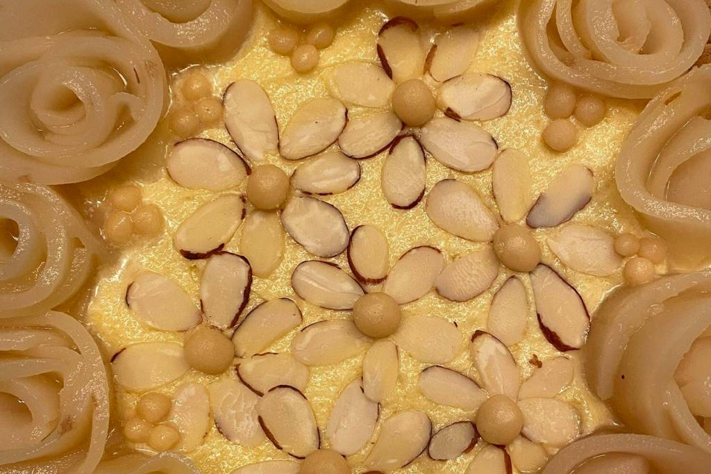 While the technical aspects of pastry are exact and unforgiving, the decorative portions provide ample space for expression. My submission was time consuming and laborious, but I quite enjoyed the time in my silent kitchen after the little one was snoring, to let my mind wander while I sliced and rolled each bloom and placed each tiny marzipan ball just so, late into the night.