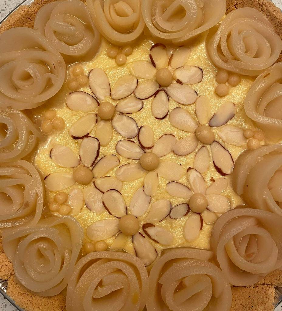 Slice thinly and arrange on the surface of the filling — be as creative as you please.