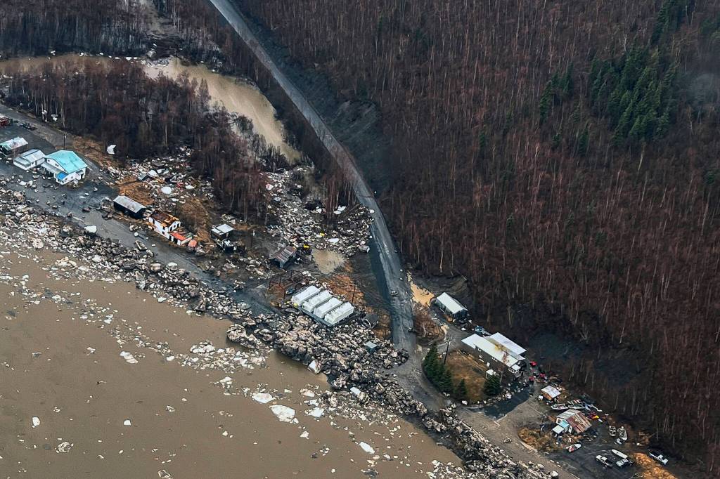 Drone video from KTUU showed numerous cars, trucks and trailers submerged, with oil and gas sheens visible in the standing water.