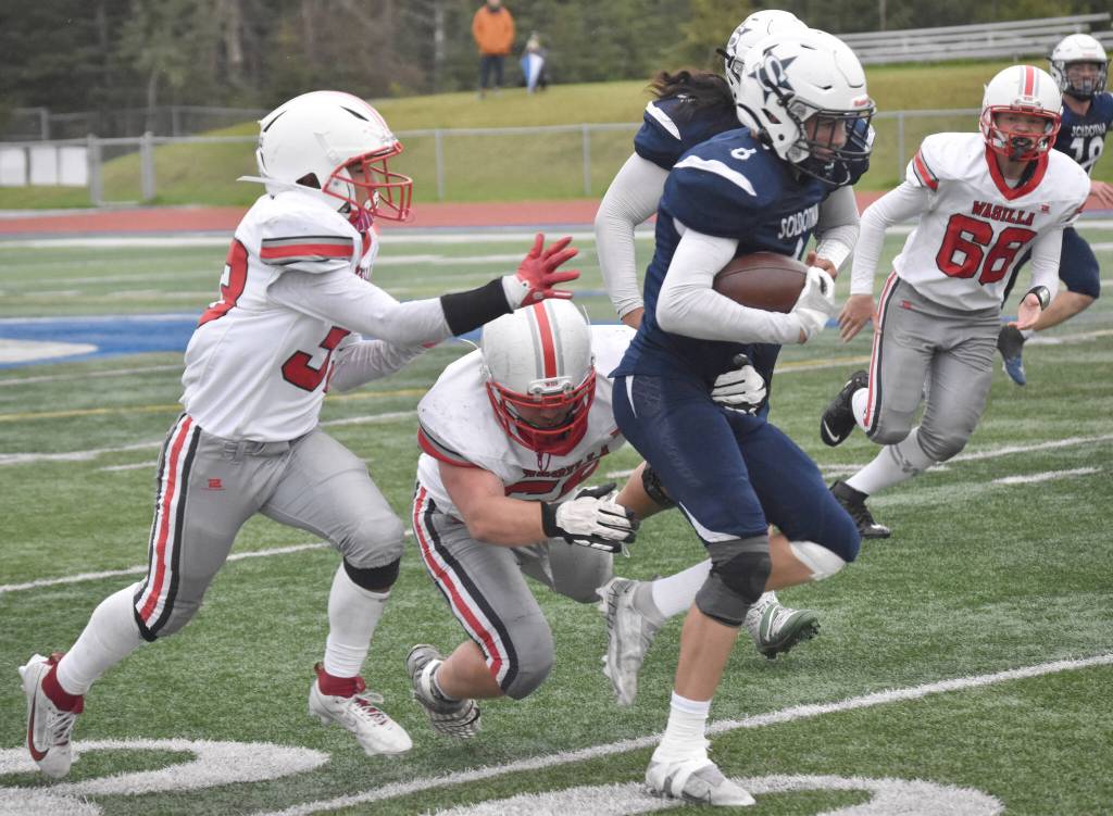 Rushing — Wasilla: Stickle 18-59, Kester 11-(-3), O’Connor 1-(-6), Lackey 2-26, Wadleigh 2-4. Soldotna: C. Peck 7-67, Z. Buckbee 5-71, Medcoff 10-58, W. Faircloth 10-72, Kemp 3-58, Wolverton 4-46, Walden 2-5, T. Ohnemus 3-8, Dickinson 1-3, Bock 2-4, Schilling 1-(-4).
