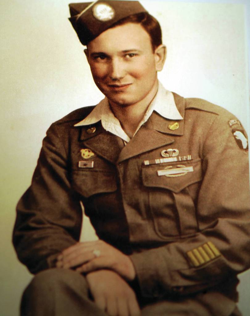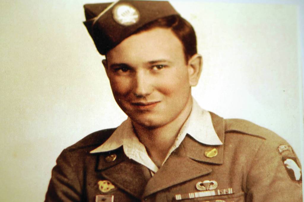 When he was discharged in 1945, he was 2 inches taller and nearly 40 pounds heavier. He posed for a portrait in dress uniform, with his many military citations on full display. On his left shoulder was a patch for the Screaming Eagles (101st Airborne). On his right breast above the pocket was a patch nicknamed the “ruptured duck,” which was sewn onto the uniforms of World War II veterans who were honorably discharged.
