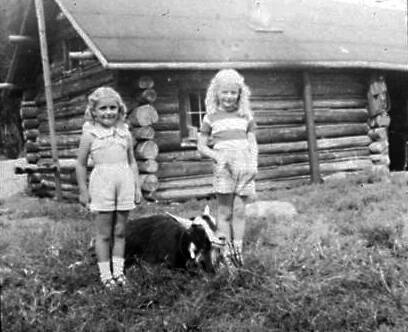 In the early 1950s, the Marge and Frank Mullen family were offered a chance to stay in the Marcus Bodnar cabin, which was much more spacious than their own. The Bodnar brothers had decided to move to Anchorage to earn some wages. Here, Eileen (L) and Peggy Mullen pose with their goats outside Marcus’s cabin in about 1951.