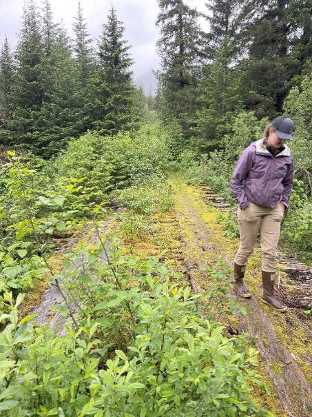 An overgrown log bridge on the Port Graham Road. (Photo by Sarah Apsens/USFWS)