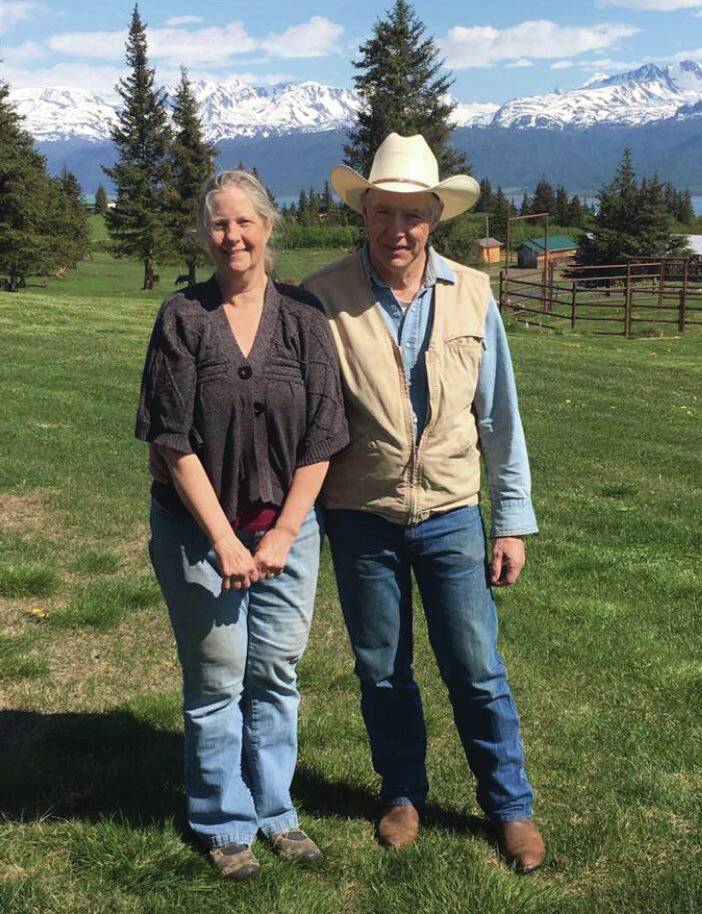 Ina (Keeler) Jones and her husband, Cecil “Spek” Jones, pose in the front yard of their home far out East End Road, near Homer.